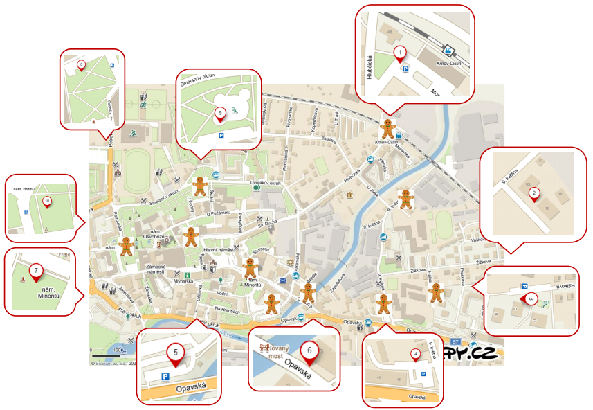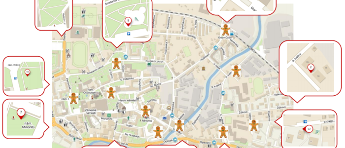 A jak je najdete? Jednoduše. Vezmete si plánek, dopravíte se na vyznačená místa a zde rozluštíte přiložené indicie. S jejich pomocí totiž odhalíte speciální úkryty s jednotlivými dílky Perníčka, které si rovnou nalepíte do předem vytištěného obrysu jeho těla.