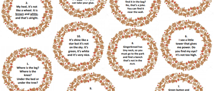 máme pro vás další aktivitu, při které se proměníte v detektivy pátrající po ztracených dílcích Perníčkova těla.