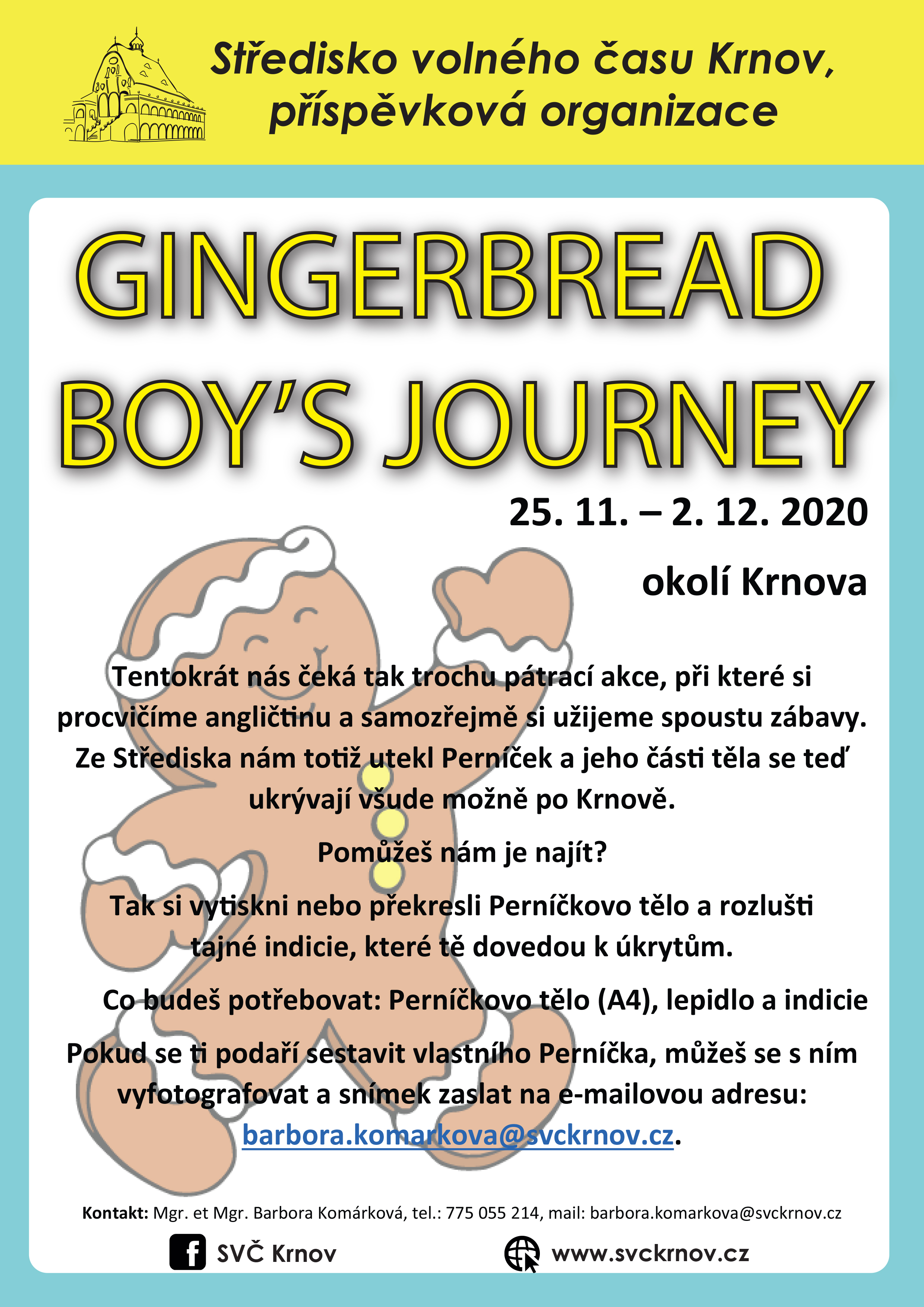 Pokud se vám podaří najít všechny dílky a Perníčka zkompletovat, můžete nám zaslat své fotografie i s Perníčkem na e-mailovou adresu: barbora.komarkova@svckrnov.cz.