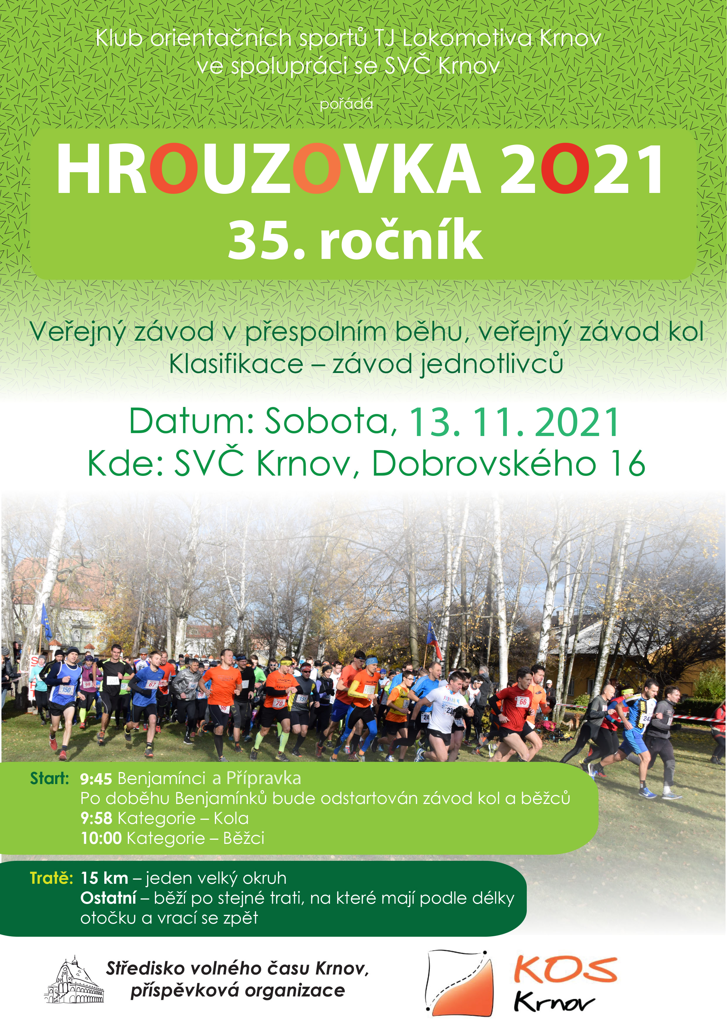 V sobotu 13.11.2021 se uskuteční 35.ročník Krnovského krosu HROUZOVKA. Jako obvykle v 10:00 startují závodníci na 15km okruh v blízkém okolí města Krnova s adekvátním převýšením, jeho povrch tvoří ze 75% asfaltové cesty, z 25% pak zpravidla zpevněné polní a lesní cesty. O dvě minuty dříve (9:58) pak startují cyklisté, kteří jedou stejnou 15 km trať, jež je připravena běžcům. Vypsána je také speciální kategorie pro nejmenší závodníky – Závod benjamínků do šesti let věku měří 600 m a startuje v 09:50.