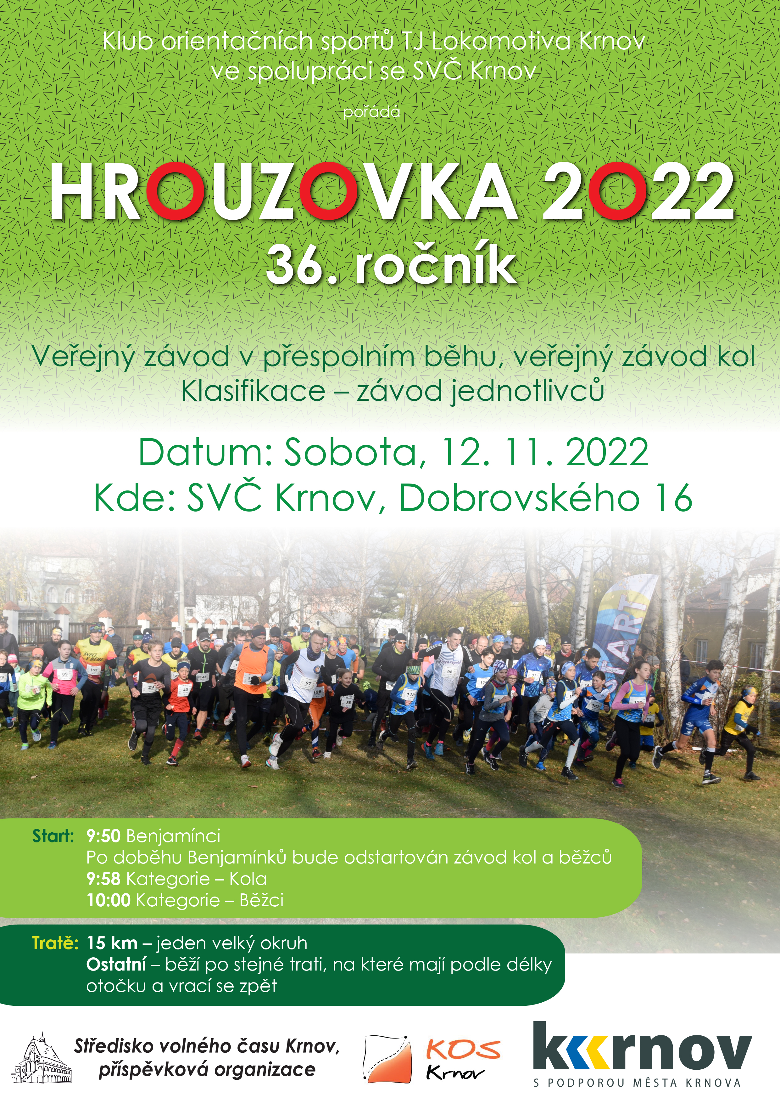 V sobotu 12.11.2022 se uskuteční 36.ročník Krnovského krosu HROUZOVKA. Jako obvykle v 10:00 startují závodníci na 15km okruh v blízkém okolí města Krnova s adekvátním převýšením, jeho povrch tvoří ze 75% asfaltové cesty, z 25% pak zpravidla zpevněné polní a lesní cesty. O tři minuty dříve (9:57) pak startují cyklisté, kteří jedou stejnou 15 km trať, jež je připravena běžcům. Vypsány jsou také speciální kategorie pro nejmenší závodníky – Závod benjamínků do čtyř let věku měří 100 m a závod přípravky (pěti- a šestileté děti) startují v 09:45.