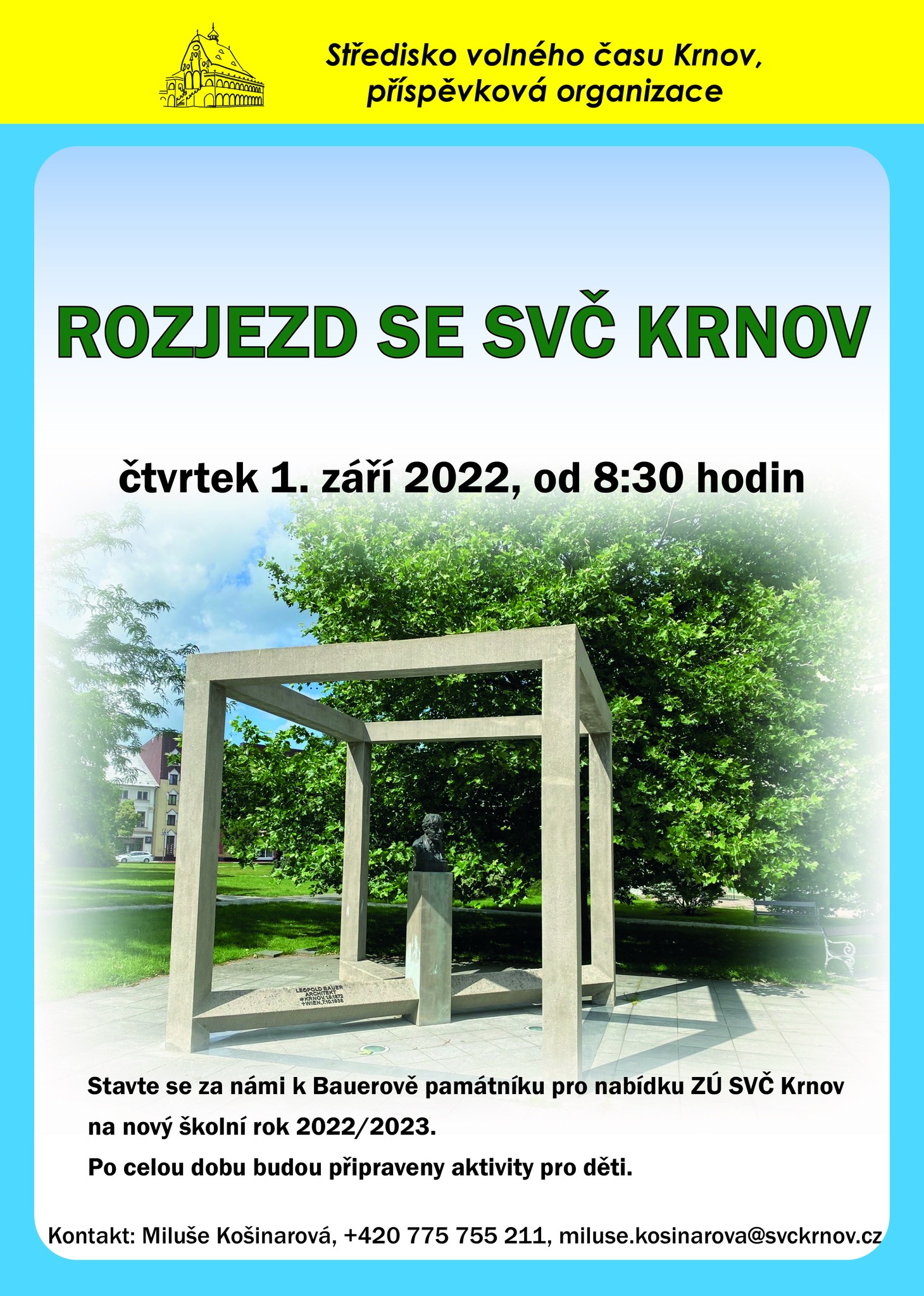 Ve čtvrtek 1. září pro vás chystáme malou ochutnávku našich zájmových útvarů a také infostánek, u kterého se můžete dozvědět veškeré podrobnosti ke kroužkům, akcím a dalším programům.