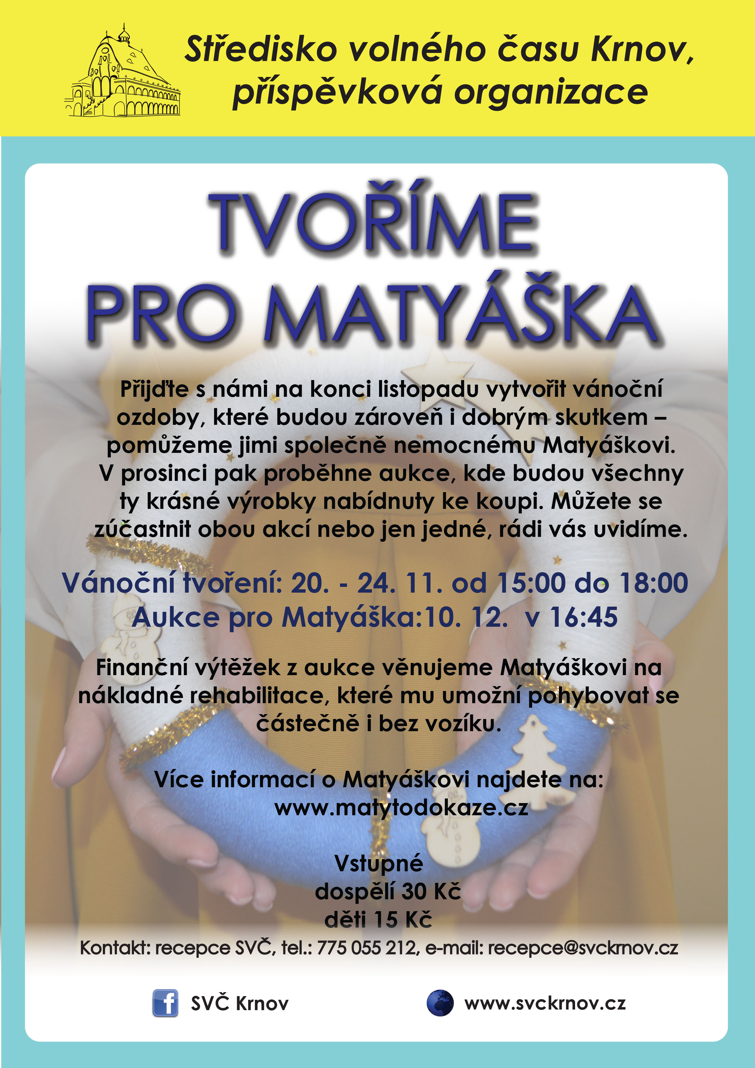 Advent je doba předvánočního rozjímání, kdy je dobré se zastavit a uvědomit si sounáležitost s našimi blízkými, ale i s ostatními lidmi. Je to také vhodná příležitost udělat radost někomu potřebnému. Proto jsme se v SVČ Krnov rozhodli, že uspořádáme akci pro Matyáška, který trpí dětskou mozkovou obrnou. Budeme rádi, když se k nám připojíte a přijdete vytvořit vánoční ozdoby, které pak 10. prosince vydražíme a výtěžek věnujeme Matymu na nákladné rehabilitace, které mu umožní pohybovat se částečně i bez vozíku.