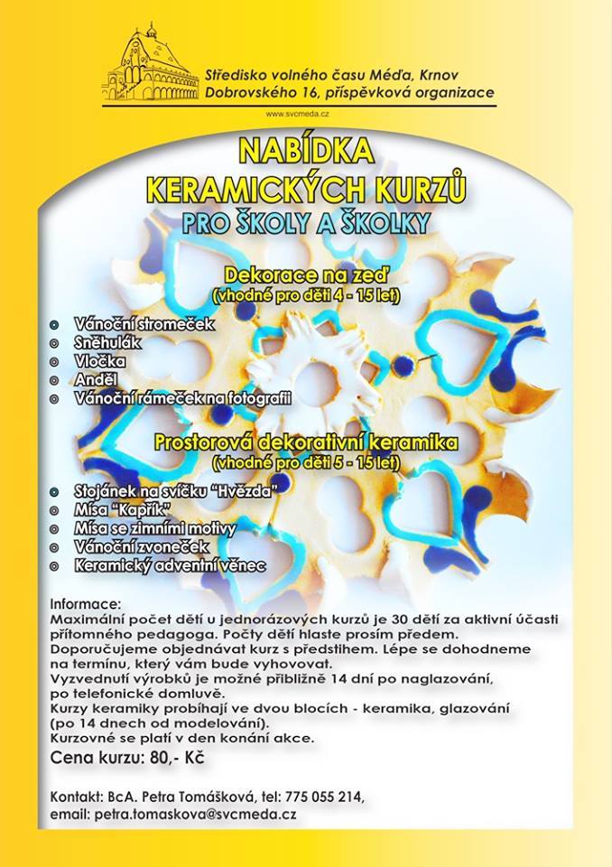 Cena za kurz, který bude z technologických důvodů rozdělen na dvě části (samotná výroba a glazování), je 80,- Kč za jedno dítě.