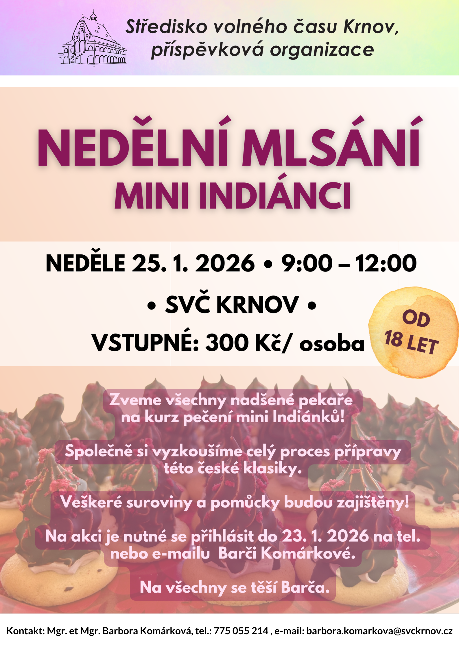 Na akci je nutné se přihlásit dopředu na tel. 775 055 214 nebo e-mailu: barbora.komarkova@svckrnov.cz nejpozději do 23. 1. 2026.
