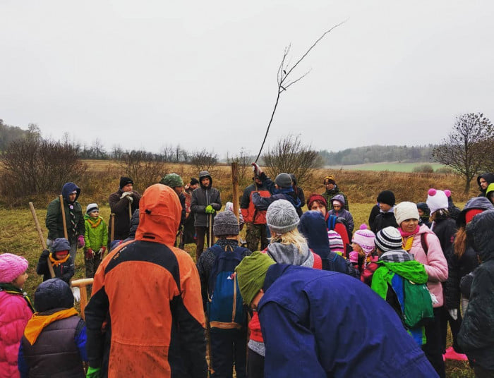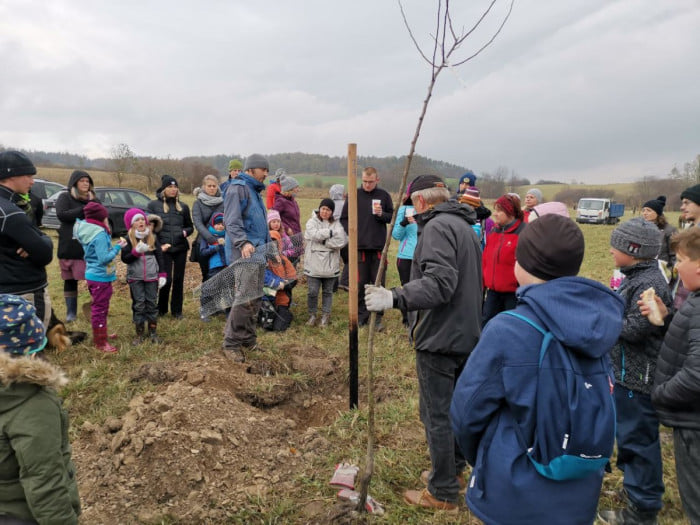 Děti se nejen dozvěděly o dlouhověkých ovocných stromech, ale také si prakticky vyzkoušely, jak takový strom vysadit. Jámy byly předem vykopány a nás čekalo stromy správně vysadit, zasypat hlínou, zalít a obalit ochranným pletivem proti zvěři.