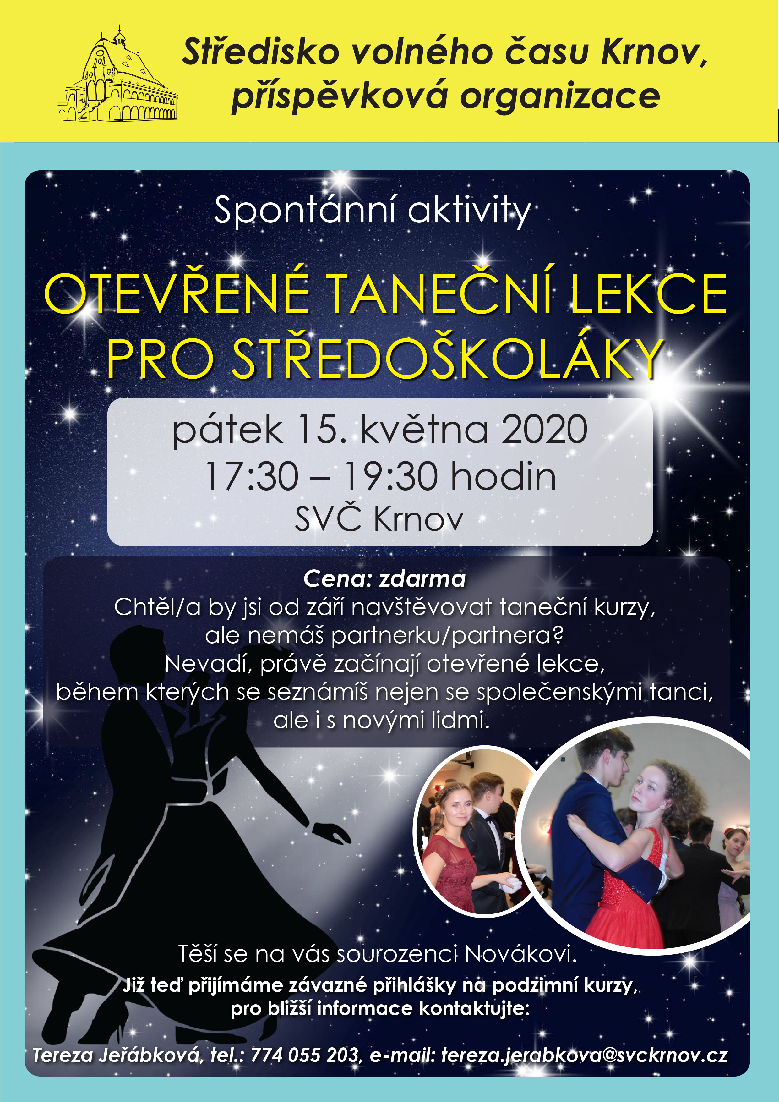 Nevadí, právě pro tebe začínají otevřené bezplatné lekce, kde se seznámíš se společenskými tanci, ale i s novými lidmi.