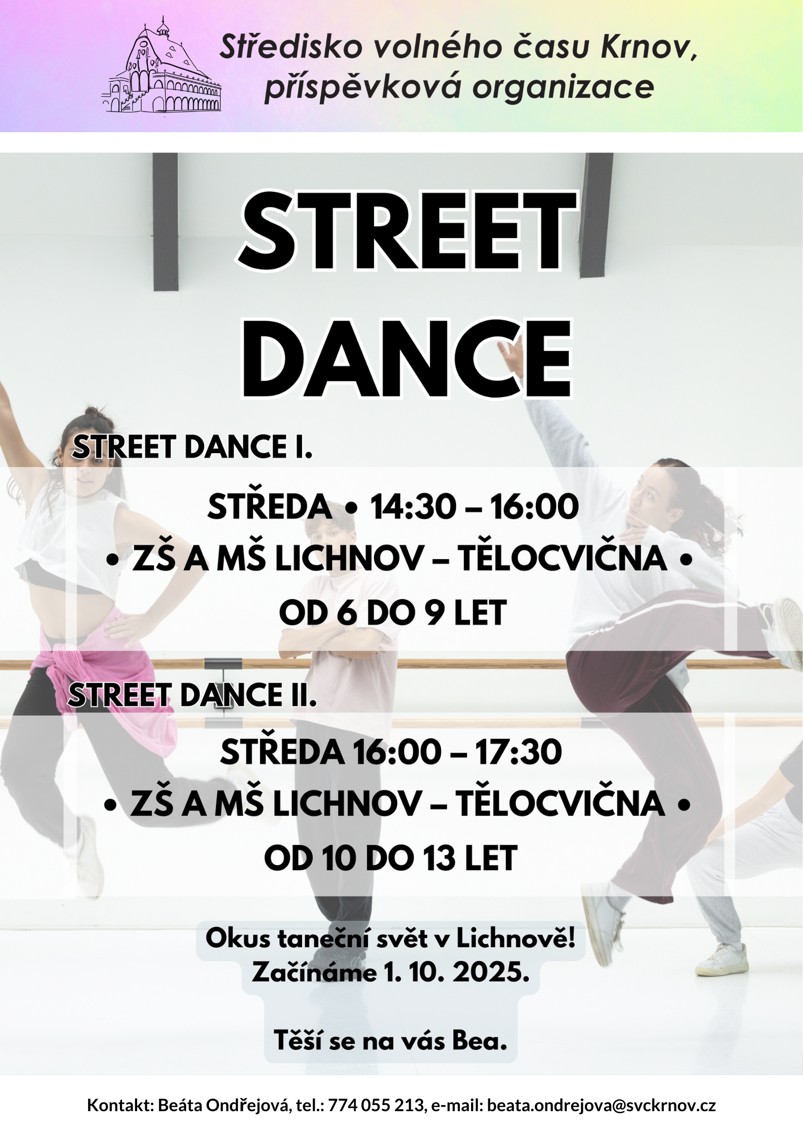 Popis: Pojď si s námi užít tanec plný energie. V kroužku se děti naučí moderní taneční kroky a veselé choreografie na oblíbenou hudbu. Budeme rozvíjet rytmus, koordinaci, kreativitu a zdravé sebevědomí.